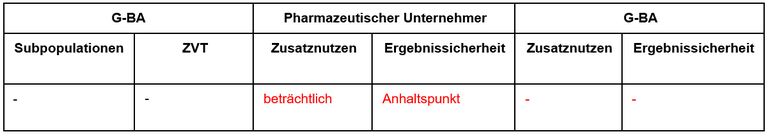- Aufgrund des Orphan-Drug-Status wird vom G-BA keine zweckmäßige Vergleichstherapie (ZVT) festgelegt. Standard ist eine Therapie nach Maßgabe des behandelnden Arztes unter Berücksichtigung der Vortherapien, des Allgemeinzustandes und relevanter Komorbiditäten.